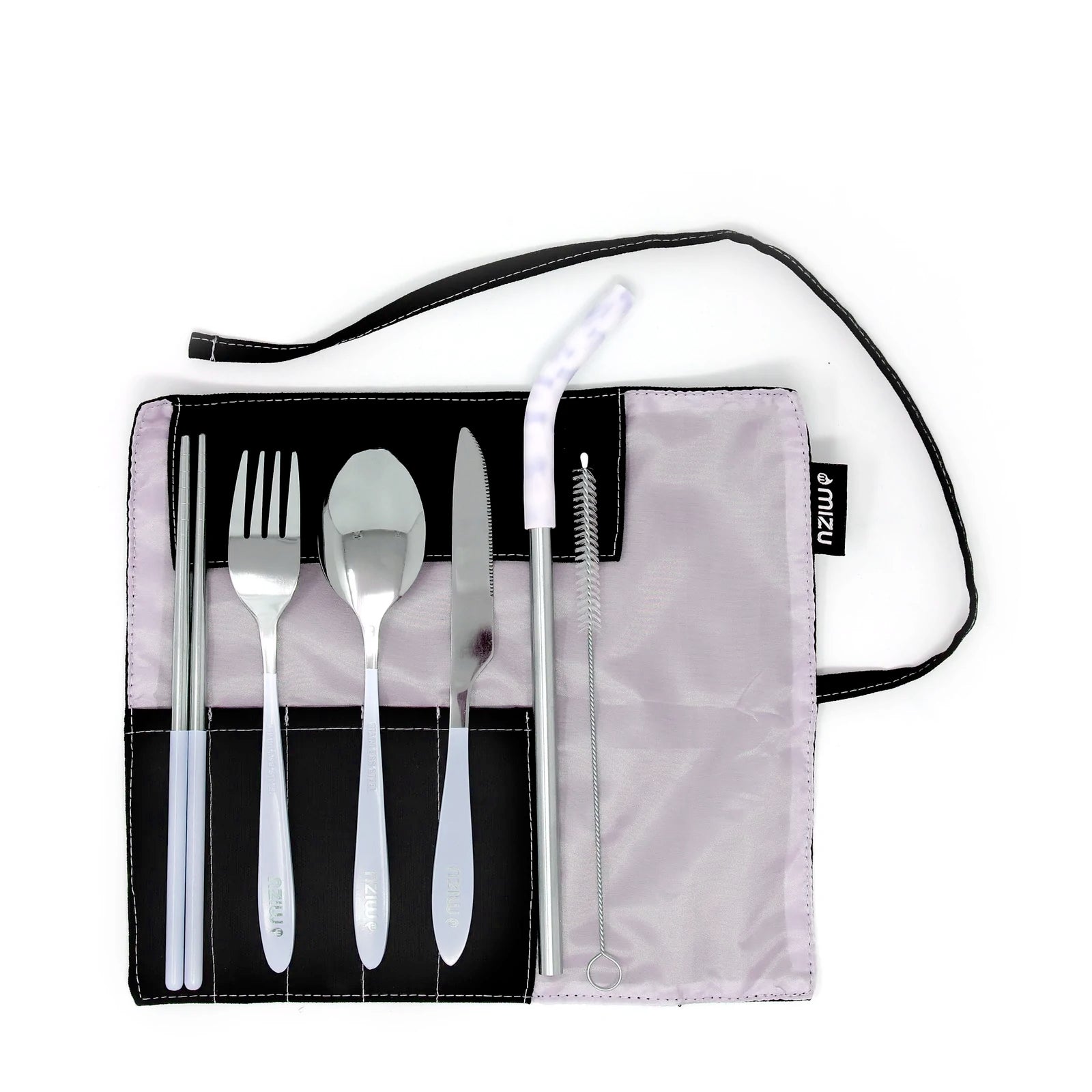 Choose from five enduro-coated colors, featuring a sturdy 18/8 stainless steel fork, knife, spoon, and chopsticks all neatly packaged in the new Mizu roll bags. It also includes a two-piece silicone and stainless steel straw, with a cleaning brush.